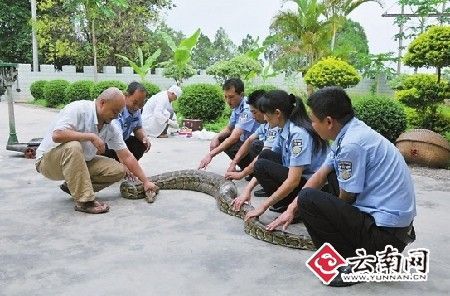 幫巨蟒清洗完身體后,民警當場為其體檢:身長3.7米,腹圍粗為55厘米,重達25公斤。經西雙版納傣族自治州林業局野生動物保護站獸醫師許定澤鑒定,這條巨蟒屬于國家一級保護野生動物的雌性金花蟒,年齡約20歲左右。根據蟒蛇約35歲左右的壽命推算,其應該正處于盛年期。據許定澤介紹,這樣大的金花蟒,實屬罕見。(戴振華 常宗波)