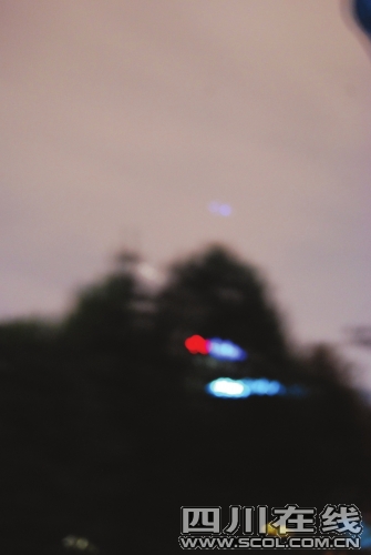 昨(7月2日)晚8點(diǎn)30分左右,成都磨子巷上空出現(xiàn)不明飛行物,附近上千市民從家中跑出,到陽臺或街上觀望:夜幕中有一藍(lán)色光團(tuán)如圓月大小,靜靜觀看時,可發(fā)現(xiàn)該光團(tuán)藍(lán)紅光交替,向西南方向緩慢移動(如圖)。該現(xiàn)象持續(xù)至9點(diǎn)50左右結(jié)束,成都市飛碟協(xié)會秘書長楊佛章初步猜測,是涂有發(fā)光材料的風(fēng)箏等物品造成的。