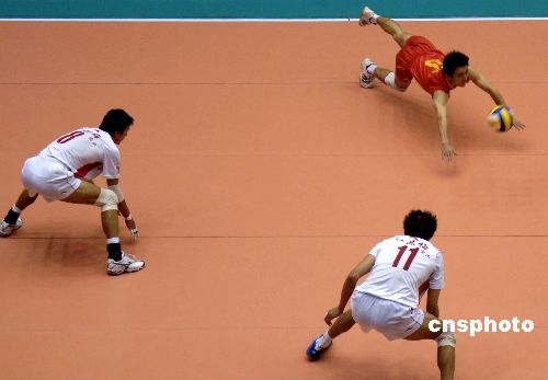 10月20日,在江蘇省淮安市舉行的2007-2008年安踏全國排球聯(lián)賽上,江蘇男排1:3不敵上海男排。中新社發(fā) 曹政 攝