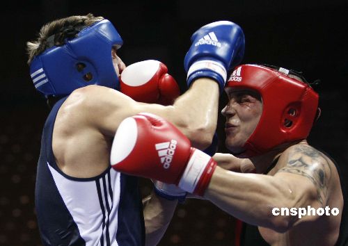 十一月十九日,“好運北京”2007年國際拳擊邀請賽在北京工人體育館進行第四單元的比賽,本次邀請賽有來自十七個國家和地區(qū)的十八支隊伍參加,采用單敗淘汰制方式,進行預(yù)賽、半決賽、決賽共七十場比賽,比賽時間為十一月十七日至二十二日。中新社發(fā) 盛佳鵬 攝
