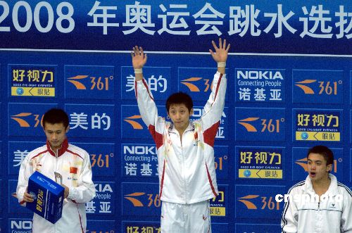 1月10日,2008年奧運會跳水選拔賽(濟南站)全部結束。在最后一天的比賽中,北京選手林躍獲得男子10米跳臺冠軍。奧運冠軍胡佳僅獲得第4名。中新社發 張侃 攝