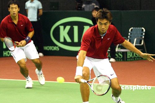 2月9日,2008年戴維斯杯亞大區(qū)II組中國隊(duì)vs黎巴嫩隊(duì)比賽在北京國際網(wǎng)球中心進(jìn)行了第三場雙打比賽的較量。于欣源/曾少昡 以6:2,7:6(4),6:2戰(zhàn)勝黎巴嫩的吉桑·扎阿蒂尼/帕蒂克·楚克里雙打組合。盡管后兩場單打還沒進(jìn)行,中國隊(duì)總比分3:0已經(jīng)確保勝利晉級下輪。中新社發(fā) 富田 攝