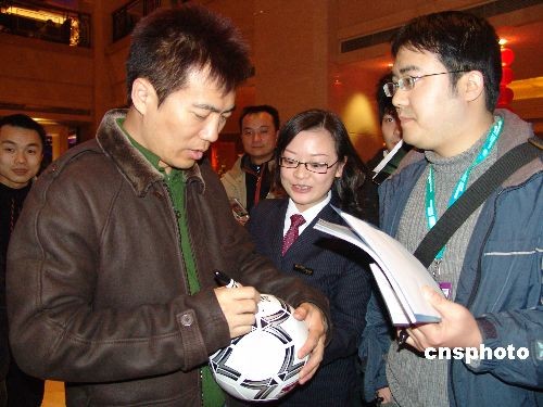 2月17日晚,著名足球解說員黃健翔在永川球迷的簇擁下從重慶江北機場抵達下塌的永川名豪國際酒店,受到媒體記者及球迷的歡迎。據了解,黃健翔回故鄉永川,是為了參加2008東亞女足錦標賽決賽和回老家祭祖。中新社發 陳仕川 攝