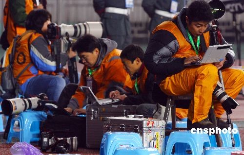 2月17日,2008東亞足球錦標賽揭幕戰在中國重慶打響。揭幕戰中,中國隊未能打破“恐韓”魔咒,以2:3惜敗于韓國,日本則與朝鮮隊1:1戰平,中國隊排名暫時位居末位。圖為球賽中場休息時,記者們在場邊爭分奪秒發稿。中新社發 郭晉嘉 攝