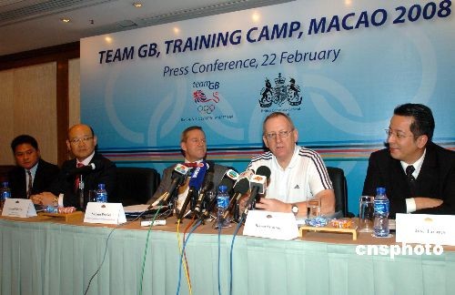 二月二十二日,英國奧運協會在澳門文華酒店舉行的記者會上宣布:英國奧運協會將在澳門設立訓練營,二百五十多名參加二00八年北京奧運會的英國運動員、教練及工作人員在奧運會舉行前兩至三周內,來澳門進行集訓。英國奧運協會向澳門特區政府及體育機構致謝,感激他們在籌備訓練營中給予的支持。中新社發 史利 攝