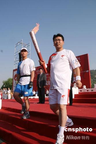 7月7日,北京奧運(yùn)火炬在蘭州進(jìn)行傳遞,第一棒火炬手是抗震救災(zāi)英雄田宇。田宇是甘肅省隴南市徽縣嘉陵鎮(zhèn)政府武裝部部長,在“5·12”地震中,他帶領(lǐng)民兵搶救出8名受困群眾。 中新社發(fā) 周兆軍 攝