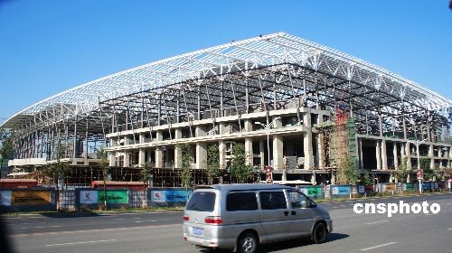 2008年11月8日,沈陽(yáng)奧體中心綜合體育館已現(xiàn)形。該館可容納8000名觀眾,可滿足羽毛球、乒乓球、體操、拳擊等賽事對(duì)場(chǎng)館的要求,還可舉辦大型音樂會(huì)、演唱會(huì)。沈陽(yáng)奧體中心建筑群“一場(chǎng)三館”,由奧體中心一座體育場(chǎng)、一座綜合體育館、一座游泳館和一座網(wǎng)球館組成。中新社發(fā) 劉寶成 攝