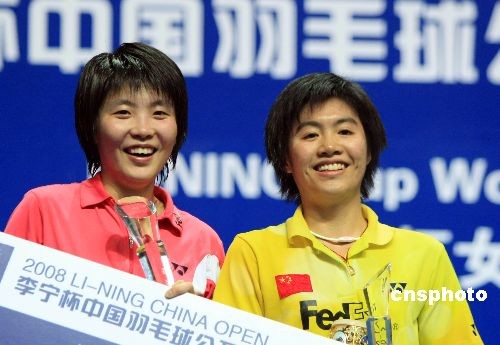 11月23日,在上海舉行的2008年中國羽毛球公開賽女子單打決賽,在兩位中國羽壇“小花”之間展開,最終23歲的蔣燕皎以2比0擊敗22歲的隊友朱晶晶奪得冠軍,這是蔣燕皎首次奪得國際羽聯超級賽冠軍。朱晶晶獲得亞軍。圖為蔣燕皎(左)與朱晶晶(右)在領獎臺上合影。中新社發 湯彥俊 攝