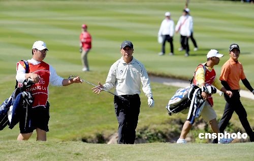 11月29日,歐米茄觀瀾湖世界杯高爾夫比賽進入第三天,中國球手張連偉、梁文沖在第三輪的四人四球賽中發揮神勇,第三輪打出-8的好成績。中新社發 陳文 攝