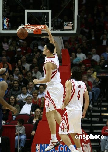 當地時間二月二十日晚,NBA火箭隊在休斯頓主場迎戰小牛隊,以93比86逆轉獲勝。中國球員姚明拿下了22分13個籃板。圖為姚明扣籃得分。中新社發 歐文 攝