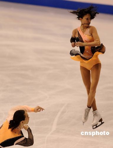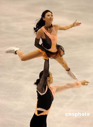當地時間3月24日晚,2009年花樣滑冰世界錦標賽在洛杉磯正式開幕。在當天晚上舉行的雙人滑短節目比賽中,中國選手、2006年世錦賽冠軍龐清和佟健得到65.18分,排名第五。衛冕冠軍德國組合薩維琴科和索爾科維名列第一。25日晚將舉行雙人自由滑比賽,根據兩項總成績決出名次。圖為龐清和佟健在比賽中。中新社發 張煒 攝