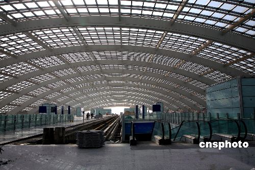 2007年11月6日,北京首都機場輕軌“3號航站樓站”接近尾聲,該車站位于首都機場3號航站樓前的交通中心內,旅客可通過扶梯直達3號航站樓。機場線全長28.1公里,自西向東共設置了4座車站,起點站——“東直門站”與地鐵2號線和13號線互為換乘站,另外還包括三元橋站(與10號線互為換乘站)和“2號航站樓站”(位于2號航站樓與停車樓之間的綠地及現狀道路之下,旅客可經通道直達2號航站樓)。該工程預計2008年4月建成,7月1日開始載客試運營。屆時,機場輕軌最高運營速度100公里/小時,東直門至首都機場運行時間為16分鐘。中新社發 洪濤 攝