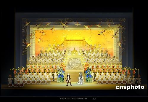 二月二十一日,中國(guó)國(guó)家大劇院版歌劇《圖蘭朵》劇組在北京公布了舞美造型圖片。圖為該劇尾聲的輝煌富麗的效果圖,視覺總監(jiān)高廣健表示,中華文化寫實(shí)細(xì)節(jié)與西方象征主義意向空間的有機(jī)結(jié)合是大劇院版《圖蘭朵》舞美設(shè)計(jì)的基本理念;尾聲的效果圖借鑒了著名的宋徽宗《瑞鶴圖》。中新社發(fā) 應(yīng)妮 攝