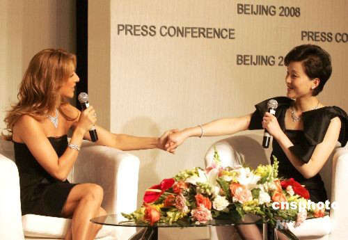 4月12日,國際歌壇天后席琳·迪翁與中國好友楊瀾在北京與記者見面,介紹她們聯(lián)手打造的頂級鉆石品牌HV Love。席琳·迪翁曾在榮獲奧斯卡多項(xiàng)大獎(jiǎng)的影片《泰坦尼克號》中擔(dān)任主唱。中新社發(fā) 張宇 攝