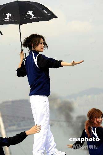 香港無線電視08北京奧運主題曲《光輝大地》四月二十一日在中環碼頭樓頂隆重錄制,陳奕迅、容祖兒等八十多位藝員頭頂烈日排練演唱,“奧運、爭口氣,會創造奇跡”等鏗鏘有力的歌聲在維港上空回蕩。圖中容祖兒在演唱。作者: 王麗南