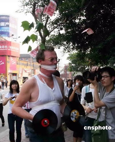 10月17日,來自法國(guó)、瑞典、荷蘭、日本、美國(guó)、新加坡及中國(guó)的20多位藝術(shù)家在重慶上演了一場(chǎng)行為藝術(shù)秀。圖為一荷蘭藝術(shù)家背著掛滿百元大鈔的樹丫,捆綁住自己走上街頭。中新社發(fā) 孟幻 攝