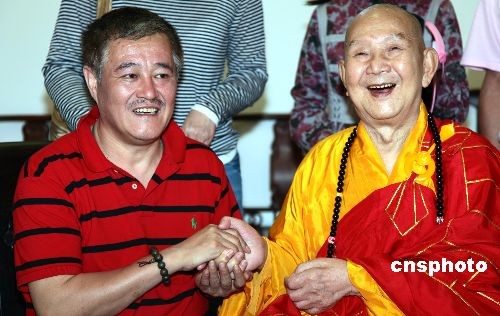 在海南三亞度假的中國著名喜劇小品笑星趙本山,二月四日攜妻兒專程到南山景區參觀游覽。圖為他與南山寺方丈新成大和尚在一起喝茶暢談。中新社發 陳文武 攝