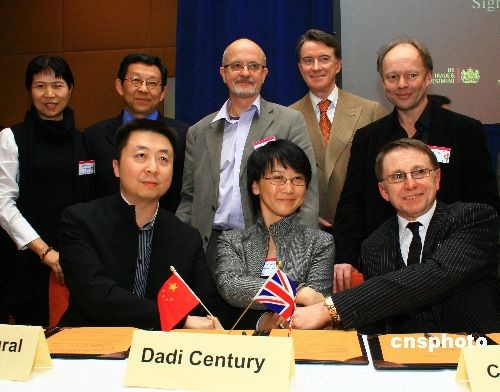 當地時間2月27日下午,中國商務部長陳德銘(后左二)和英國商業、企業和制度改革大臣曼德爾森(后右二)共同見證了中英企業合拍電影《楊貴妃》的簽約儀式。圖為北京春秋鴻文化投資有限公司、大地時代文化傳播(北京)有限公司與英國Capital Music公司的代表簽署1400萬美元合拍協議。中新社發 李鵬 攝