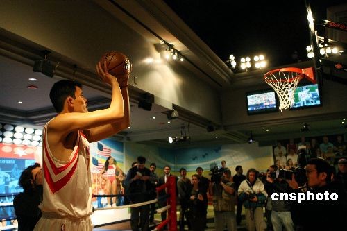 NBA中國球員姚明的蠟像18日首次在紐約杜莎夫人蠟像館與公眾見面,引來眾多媒體關注。 中新社發(fā) 李靜 攝