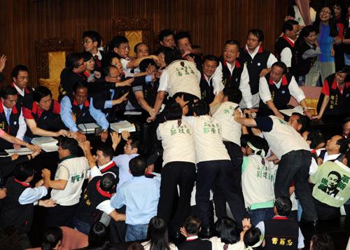 現(xiàn)場“立委”多人扭打成一團,民進黨“立委”以潑水、丟東西等方式抗議,該黨“立委”郭玟成、劉建國跌下摔落,國民黨“立委”吳育升也受傷。
