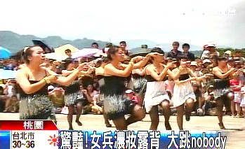 中新網7月10日電 據臺灣TVBS報道,臺灣陸軍桃園空旗旅營區10日開放,除了直升機秀和儀隊操槍表演之外,營區20位女軍官特別化起濃妝,穿上高跟鞋和露背裝,大跳苦練一個月的“NOBODY”。她們笑說,沒想到跳舞比操戰技還要累。