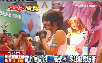 據(jù)臺(tái)灣TVBS電視臺(tái)報(bào)道,臺(tái)北計(jì)算機(jī)展大會(huì)舞臺(tái)還沒開鑼,參展廠商就派巧克力膚色辣妹開始搏版面,沒有舞臺(tái)就在展場(chǎng)地毯展現(xiàn)動(dòng)感。有的廠商由于和隔壁搞競(jìng)爭(zhēng)搶眼球,上午11點(diǎn)半的Show Gilr表演,足足提早1小時(shí)。
