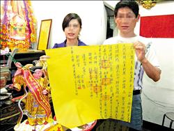 中新網(wǎng)8月11日電 你相信人神戀嗎?在嘉義有一名情路坎坷的男子,無意間幫朋友酬神,他說后來感應(yīng)到神明闖入夢(mèng)中,與其相戀,還說要以身相許,他果真由父母作主,把神明給娶回家供奉。這場(chǎng)另類婚禮還特地找來年輕女子代替女主角,雙方象征性互戴戒指完婚。