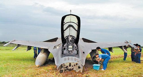 當年6月26日機號6812的F-16B型雙座機,由嘉義聯隊莊姓分隊長駕駛,后座載著“國防部”整評室副主任陳姓少將,進行戰術攔截課目的熟飛,降落時,未注意跑道積水,致使戰機落地時,飛行員施放阻力傘后戰機嚴重右偏,雖然隨即拋棄阻力傘,立即使用方向舵及煞車改正偏右狀況仍無效,戰機降落跑道上行進約一公里后沖向草坪,機身嚴重受損;經評估修復戰機,不包括發動機的修復即要花800多萬元新臺幣。