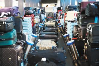 桃園機場第二航廈行李自動處理系統史無前例大當機,托運行李堆積如山,等待人工處理。