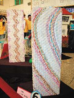 高韻芬說,“稅捐處”的倡導發票較為樸素,用來卷成紙棒,當作燈罩的基底;各店家發票的廣告圖案則用來做色票,并用傳統的編織方法以紙棒為經,色票為緯,經過排列,色票就會形成圖樣,發票與發票間的空隙則可透光,“完成一個作品至少要耗費50多個小時”。