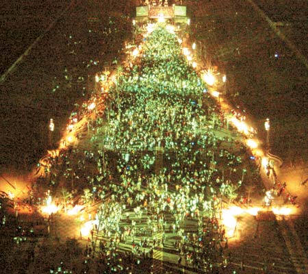 在臺灣省高雄市夢時代廣場旁的時代大道上,一場“萬輪壓馬路、排棵圣誕樹”活動正在舉行。只見五萬人騎自行車或踩直排輪游行后,在時代大道上聚集排出一棵長兩百米、寬八十米號稱世界最大的圣誕樹,場面相當壯觀。臺灣《中國時報》圖