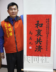黃錫麟高舉馬英九贈給“中華保釣協會”的題詞。