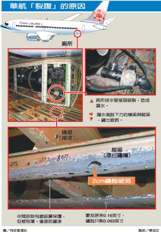 據(jù)臺(tái)灣《聯(lián)合報(bào)》報(bào)道,該機(jī)除了蒙皮裂痕,機(jī)身內(nèi)部橫梁、縱梁都有銹蝕情況,其中連接蒙皮的縱梁部分區(qū)域的防銹漆已銹蝕脫落,出現(xiàn)兩厘米的大洞,橫梁上方的廢水箱旁的排水管接頭斷裂,分析應(yīng)該是由此漏水,導(dǎo)致機(jī)身結(jié)構(gòu)腐蝕。