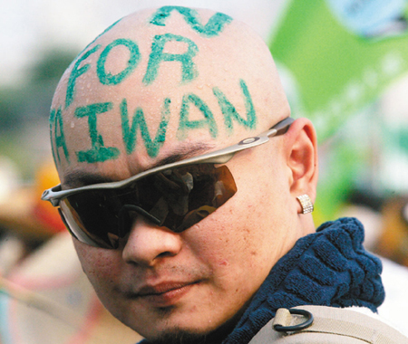 民進黨宣傳“入聯”絞盡腦汁,小到郵戳,大到101大樓,都有UN FOR TAIWAN。圖為民進黨高雄市“入聯”游行,一名綠營支持者剃光頭寫上英文。記者劉學圣/攝影