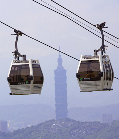 雖有打雷閃電停駛、當機,以及悶熱的不良現(xiàn)象,大家還是無法抵擋高空美景誘惑,臺北貓空纜車7月營運以來已有200萬人次搭乘。圖為貓纜遠眺臺北101。記者周永受/攝影
