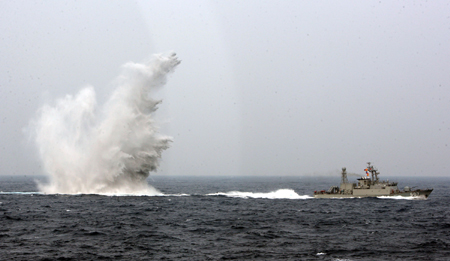 臺灣海軍今天在高雄左營基地舉行春節戒備操演,重點加強反潛艇演習,動員了大小總共十六艘各式艦艇與反潛機,執行包括反快艇作戰、緊急攻潛、海空協同反潛及空中戰力整補,過程相當逼真。“中央社”圖 張皓安 攝