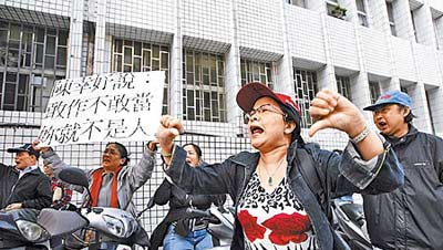 吳淑珍出庭時,場外泛藍群眾比出倒扁手勢嗆聲。
