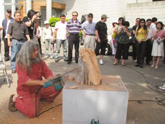 踩線團昨天上午造訪三義,當地西湖度假村請來雕刻家表演冰雕;木雕博物館則請到藝師現場示范木雕,以樟木為材,短短十分鐘就創作一座母抱子雕像,踩線團大贊“有功力”。