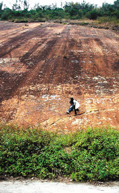 中新網12月18日電 南投縣中寮鄉“粗坑大峭壁”奇景,地質專家推斷年代是古老的第三紀地層,已有三千萬年歷史,最近成為暴紅旅游景點。許多游客競相攀登峭壁還噴字,留字表示“到此一游”。當地居民看見珍貴的地景遭到破壞相當心疼。