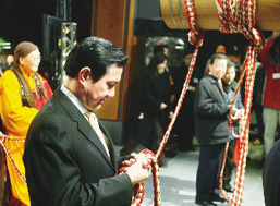 中新網(wǎng)2月9日電 綜合臺(tái)灣媒體報(bào)道,國(guó)民黨“大選”候選人馬英九在年除夕到法鼓山撞鐘,沒想到繩子竟然應(yīng)聲而斷,讓他非常尷尬,幸好搭檔蕭萬(wàn)長(zhǎng)趕緊解圍,把自己的繩子分了一半給馬英九拿。有人解讀這是觸霉運(yùn),不過(guò)馬英九自己的解讀是,他是在幫臺(tái)灣把厄運(yùn)甩掉。