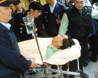 剛被轉送到板橋醫院的陳水扁,面對記者的提問時,曾一句話都沒回答,躺在擔架上,臉色變得憔悴,全身上下最后一絲的力氣,似乎都用在緊閉雙眼上。