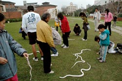 57歲的李哲能7日下午到了公園草地后,打開旅行袋,7條大、小白蛇立即竄出爬行。帶兒子散步的李太太剛好經(jīng)過,被突如其來的驚悚一幕嚇一大跳,趕緊拉著兒子跳開說:“這里怎么會有白蛇出現(xiàn)?”其它民眾看見,無不好奇湊上前觀看。