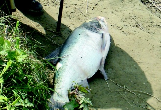 釣客在臺南縣麻豆鎮曾文溪釣獲30臺斤重的大頭鰱,用力拉上岸時引發心臟病送醫不治。圖片來源:臺灣《聯合報》