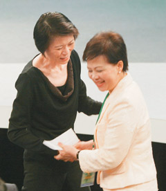 二00八年臺灣地區領導人選舉候選人第二場電視辯論會昨天舉行,馬、 謝辯論之前,馬英九夫人周美青(左),特地走向謝長廷夫人游芳枝(右)致意。臺灣《聯合報》圖 黃義書 攝