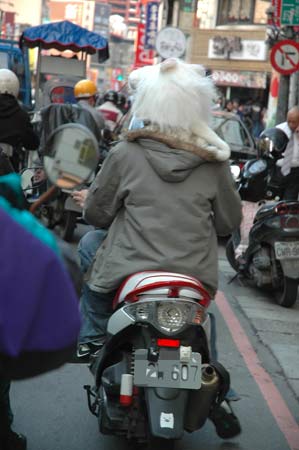 臺灣近來雖然天氣回暖,氣溫上升至二十余度,但臺北縣街頭,偶見摩托車手搞噱頭,在安全帽外面套上皮草(用動物的皮毛所制成的服裝),引起過往行人側目。“中央社”圖 黃旭升 攝