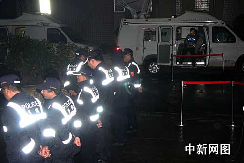 12月29日下午2時,臺北地方法院開始召開羈押庭,就是否收押陳水扁做出裁決。時間已過去十一個小時,最終裁決仍未有結果。圖為臺北地方法院靠近司法警察室的側門口。警察仍在戒備。(圖文/陳立宇)