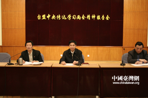 臺盟中央組織部副部長蔡國斌傳達了全國政協十一屆三次會議精神。蔡國斌介紹了政協會議的基本情況,臺盟中央、臺盟組委員的大會發言、提案及委員們的有關討論情況。