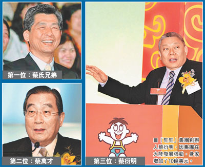 今年上榜富豪中僅5人錄得資產(chǎn)增長,當(dāng)中3人得益于大陸業(yè)務(wù)發(fā)展。“大贏家”是旺旺集團(tuán)創(chuàng)辦人蔡衍明,集團(tuán)在大陸發(fā)展強勁,身家急漲10億美元,排名從第9名跳升至第3名。另一食品集團(tuán)康師傅的創(chuàng)辦人魏應(yīng)州,身家也大增5.5億美元,升至第5名。