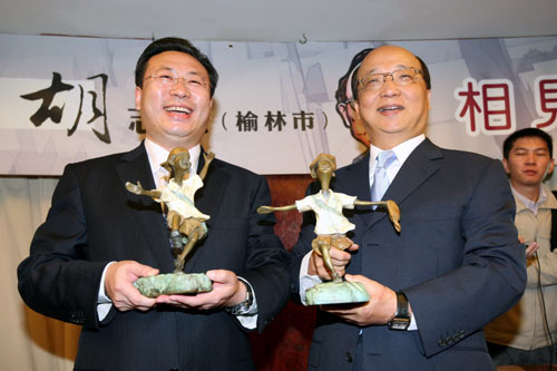 據“中央社”報道,臺中市長胡志強今天在臺中與陜西榆林市長胡志強相見歡,臺中市長胡志強特別請雕塑家余燈銓創作一組“阿吉、阿祥”的“相見歡”雕像,送給榆林市長胡志強;他還開玩笑的說“兩強相會,強中自有強中手”。