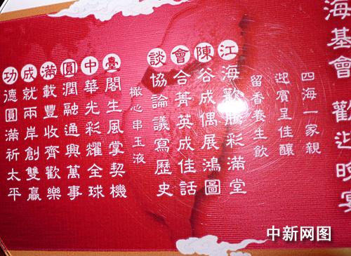 ;鶗䴙橥硌缣刂埔环荨安仡^詩”菜單:“江海歡騰彩滿堂/陳谷成偶展鴻圖/會合精英成佳話/談協論議寫歷史/臺閣生風掌契機/中華光彩耀全球/圓潤融通興萬事/滿載豐收齊歡樂/成就兩岸創雙贏/功德圓滿祈太平”,以每句詩的頭一個字組成“江陳會談.臺中圓滿成功”。
